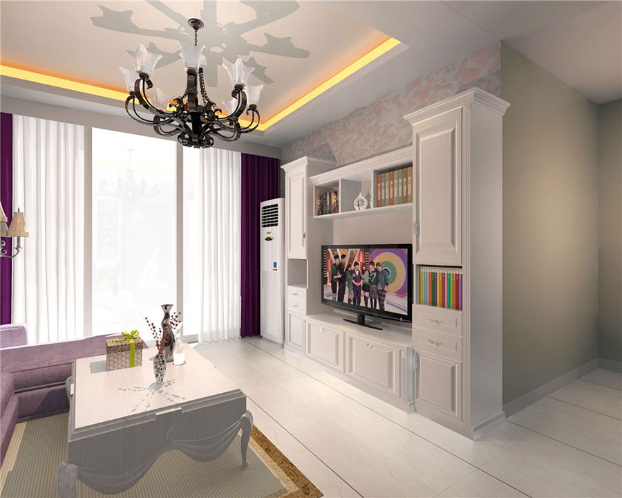 入眼處,便被精致的吊燈所吸引,饒有設計質(zhì)感的造型,純黑色的金屬質(zhì)感,與整體的雅白色交相呼應,整體布局更顯和諧與優(yōu)雅。燈光下,雅白色的電視柜與背景墻形成明顯的色彩反差,給人眼前一亮的感覺(jué)。